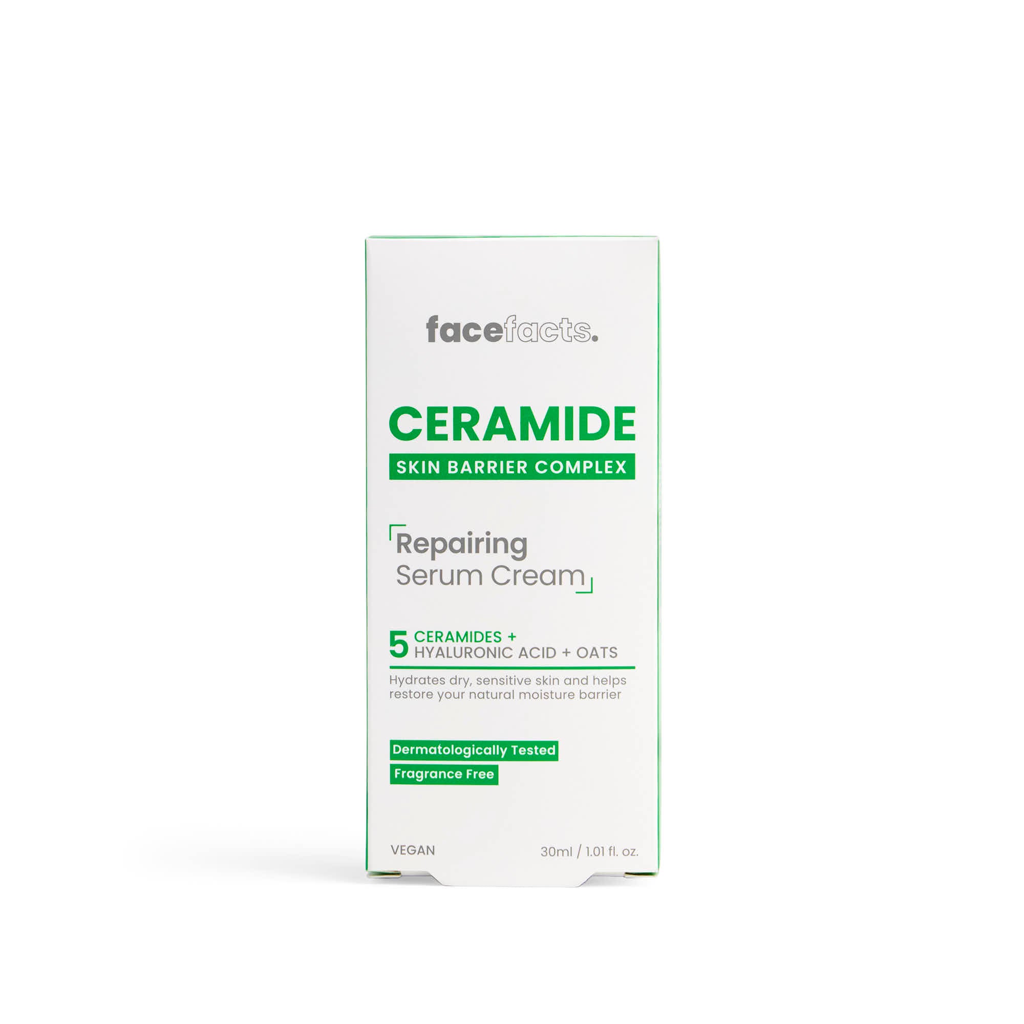 Be kind to your skin with our very light and fast-absorbing face serum, ideal for dry and sensitive skin. Formulated with our skin barrier complex of 5 Ceramides, moisture-locking Hyaluronic Acid, soothing, Oats, Glycerin and Vitamin E, our serum is designed to support, protect and replenish the skin barrier. Apply daily for optimal hydration, balance and skin health. Give your skin the extra care it deserves! Vegan Friendly & Fragrance Free.